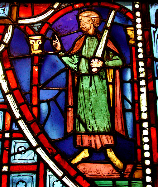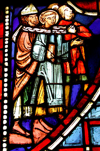 On the left are St. Valerian, identified by his mitre, and St. Vincent, wearing his dalmatic. On the right the provost Dacian expostulates with them, "What sayest thou Valerian which under the name of thy religion dost against the decrees of princes?"