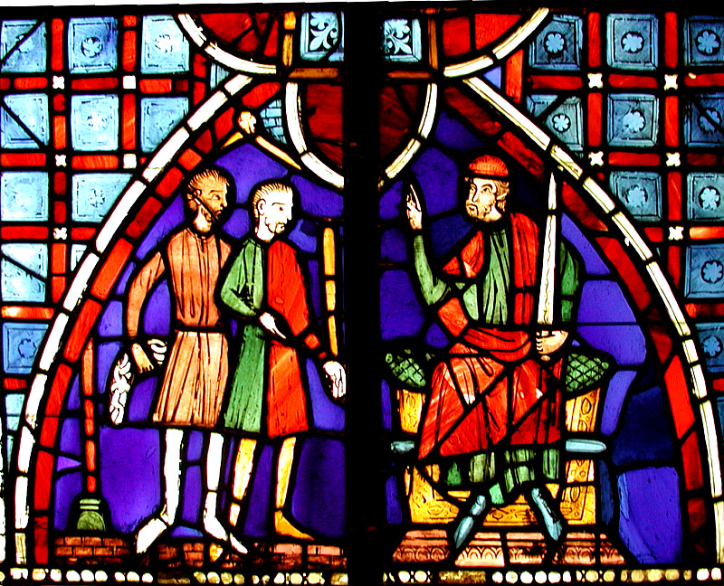 On his throne, Dacian makes the gesture indicating speech and holds a sword symbolizing his authority. His green tunic and red mantle will be repeated in his portraits in the other windows in the sequence. To execute the provost's command, the shorter servant has a cudgel and the taller one a length of chain. The chain appears in the next two scenes in the sequence; the cudgel, only in the final scene.