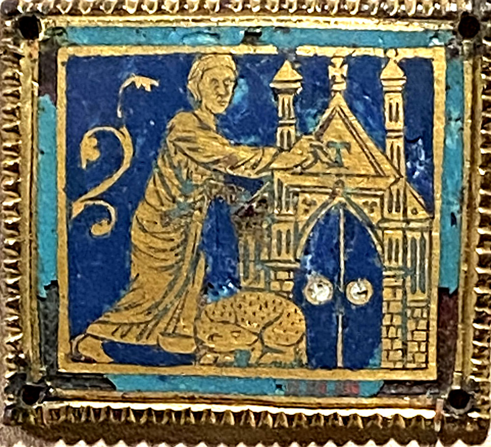 In the Christian reading of this passage, the unblemished lamb is Christ, the innocent victim whose blood saves the faithful. The houses signify his home, the Church, and the blood on the doorposts and lintels is the sign of the Cross.1 Accordingly, the lamb in this image represents both the literal lamb of the ancient rite and Christ, the "lamb of God." The artist represents the "houses" of Exodus 12:7 with their doorposts and lintels as a Christian church with its belltowers and tympanum, which instead of blood the Christian marks with a tau, the sign of Christ's cross.