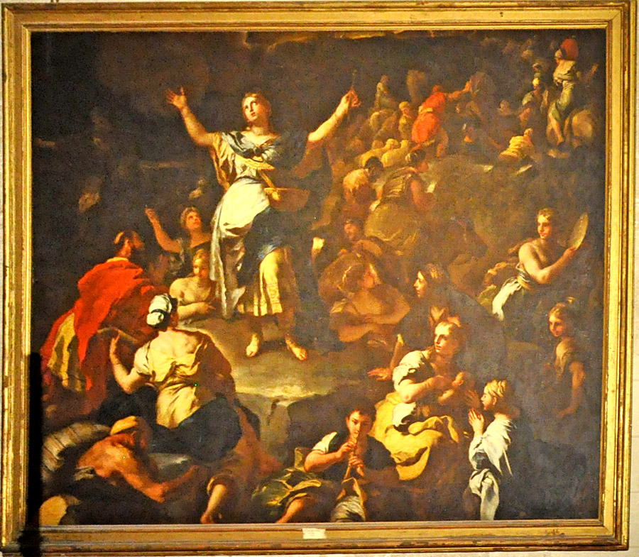 The picture above illustrates Exodus 15:20-21. Moses' sister Miriam takes a timbrel and leads the women in a song of rejoicing. In portraits the timbrel is often used as her attribute, as at right.