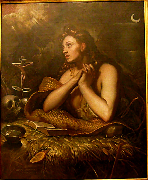 St. Mary Magdalene is pictured in her cell with the usual appurtenances of a hermit: the skull, the cross, the open book. Also common in images of hermits in their cells is the light from Heaven. As in many images of the era, her past as a fallen woman is expressed through physical beauty, blond hair, and a paucity of clothing.