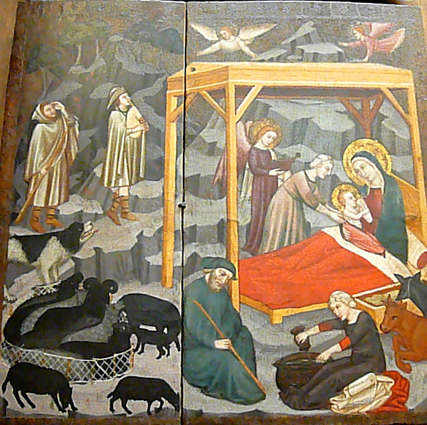 Birth of Jesus. However, dogs are not in evidence in any of the images I have seen of the shepherds' adoration at the manger.