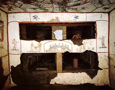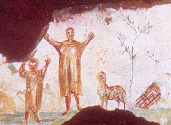 This is the back wall of the cubicle. Above, the figure framed by the two doves is Jonah, reclining as under the gourd tree. Directly below, in the center of this photo, is a Eucharistic banquet. To the left of the banquet, a priest extends his hands in a symbolic epiclesis while a worshipper stands in the orant posture.