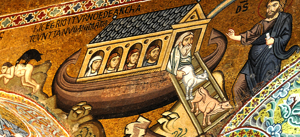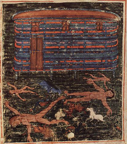 A panel from the 12th-century Noah cycle in the Palatine Chapel, Palermo. To see the entire cycle with commentary, follow this link to the description page. OTHER IMAGES ![]() From a 4th-century sarcophagus lid: a young, beardless Noah in an ark pictured as a chest with a hinged lid and a hasp. (See the description page for the context and commentary.) ![]() The ark pictured in the Noah cycle at Monreale. The view of the structure amidships resembles the end of a chest. Bodies float in the water, and a raven pecks at one of them. (See the description page for the rest of the cycle and commentary.) ![]() From the Ashburnham Pentateuch (6th or 7th century). The ark is shaped like a chest but has windows and a door. Dead bodies float in the waves beneath. (See the description page.)