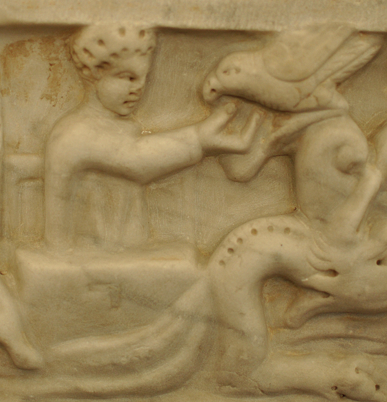 (example). In the catacombs, he stands in orant posture and usually faces the viewer. In a few cases we see him in profile facing the dove, and that is how we usually see him in the sarcophagi. The Noah of the catacombs is always young and beardless, but in the sarcophagi he almost always has a short, square beard like St. Peter's. Later images will keep the beard but without the resemblance to Peter's.