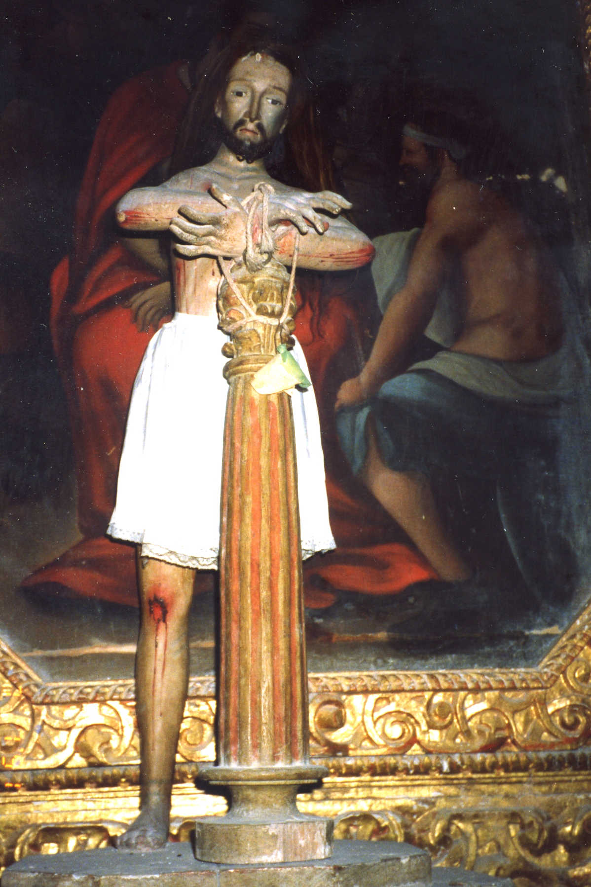 Traditional images of the scourging of Jesus (John 19:1) have him tied to a column. As with most Mexican santos of the Passion, this one exhibits the bloody lesions he suffered from his tortures.
