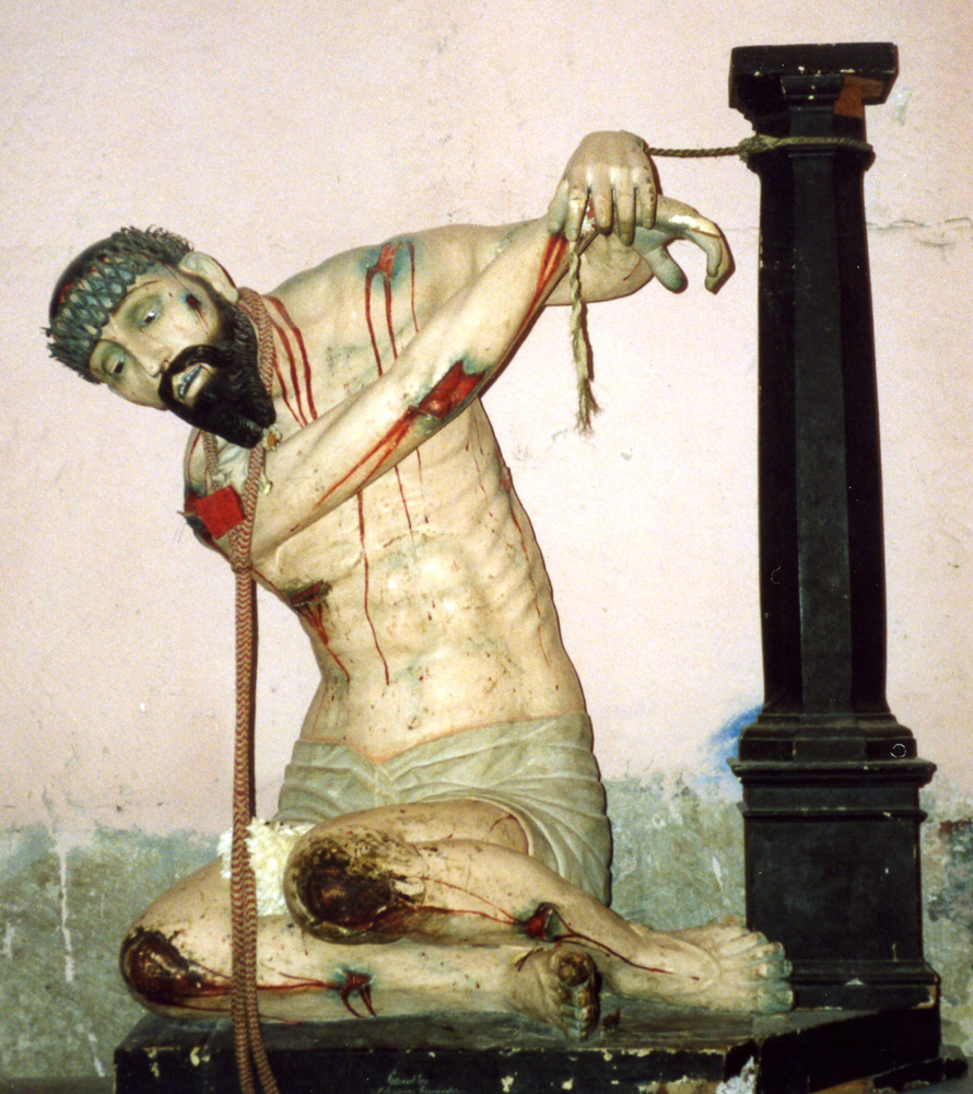 Traditionally images of the scourging show Jesus tied to a pillar. Most Oaxaca santos of this type have him standing, but here his fallen body pulls at the pillar to which it is tied. The horrifying lesions are typical of Passion santos in Mexico.