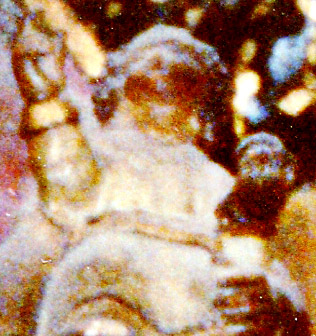The Anne figure is painted with golden 6-petaled flowers, but the front of the robe has not been finished. The mantle is painted with large arabesques of flowers and leaves. It is as delicate as work in stiffened cloth, but Sr. Arcadio Aquino Cruz, the topil of Santa Ana del Valle at the time of our visit, informed us that the entire ensemble is wood. The Mary figure wears a red robe and a blue mantle edged in gold; there is no pattern on either robe or mantle. On the front edge of the mantle is a chip which reveals the wood beneath. The child is in white.
