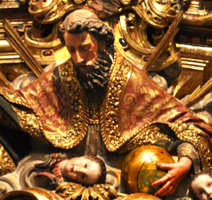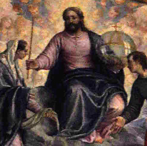![]() Villanueva y Barbales, God the Father at the summit of the Immaculate Conception Altar, Oviedo, Spain. (See the description page.) ![]() Christ with a mappa mundi orb, detail from Paolo Veronese's Martyrdom of St. Justina. (See the description page.) ![]() Detail from A. Pozzo's Trinity Altarpiece: Father and Son flank a large orb while the Holy Spirit hovers above it. (See the description page.) |