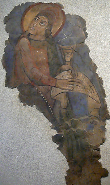 The museum's label identifies this fresco as St. Mary of Egypt. It is quite rare to portray that saint in an intact gown. In the Golden Legend, when the monk Zosimus first sees her she is naked and asks him to give her his mantle. But in most images her nakedness is covered only by voluminous hair or by a loose mantle that falls from one shoulder. The scroll is even more unprecedented.