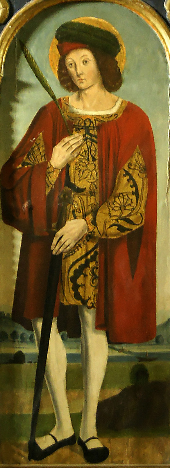 The most basic type of St. Pancras image is like the one at right: a beardless youth in boots, a tunic, and something like a toga points to Heaven with his right index finger and holds in his left hand a palm branch and a book. Tbe book will have the words VENITE AD ME ET DABO VOBIS OMNIA BONA, "Come to me and I shall give you all good things." No such phrase is found in scripture, nor in the vitae and other memorials of Pancras collected in the Acta Sanctorum and the Golden Legend. It appears to be a combining of Matthew 11:28 ("Come to me, all you that labour…and I will refresh you) with 24:47 (where the master puts the faithful servant super omnia bona, "in charge of all good things"). In a second type of image St. Pancras will also have a sword, the implement of his martyrdom, as in the second picture at right. That picture also exemplifies a practice in the Renaissance of putting him in sumptuous contemporary dress. In the third type the saint is erroneously portrayed as a soldier, with the sword serving as an emblem of his profession, as in the third picture. This error may be due to a misreading of earlier images with the sword, especially as his feast day is shared with the military saints Nereus and Achilleus. St. Pancras is beardless in all his images, but as the second and third pictures show, there is a tendency to make him look rather more than 14 years of age.