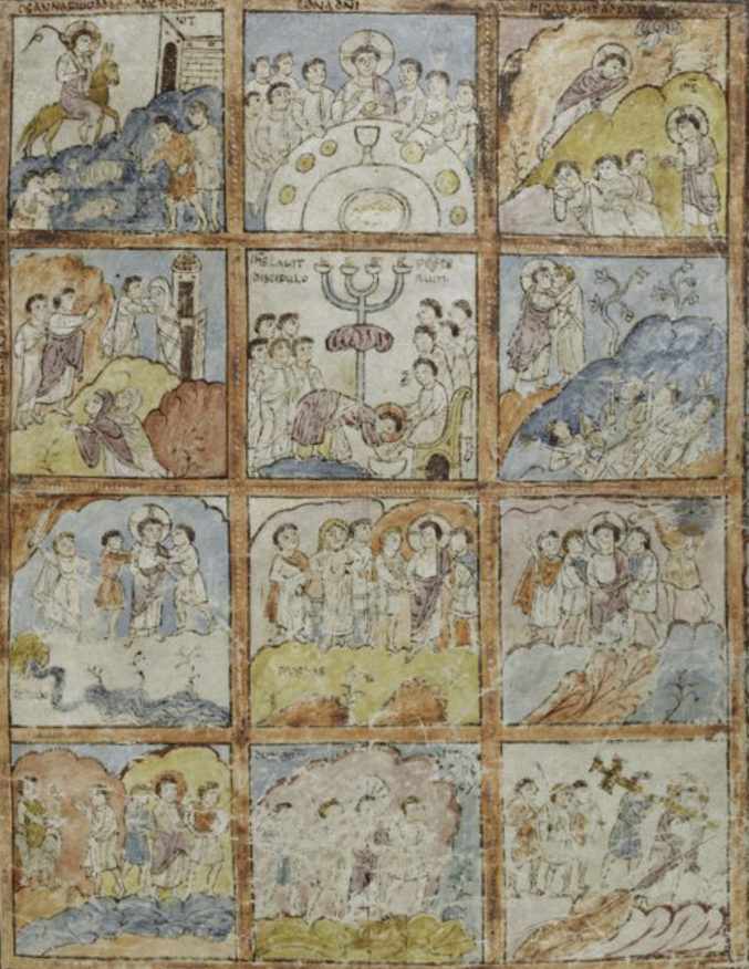 The word in the upper margin is cena domini, "The Lord's Supper," that is, Jesus' pronouncement that the bread and wine are his body and blood (Matthew 26:26-29, Mark 14:22-25, Luke 22:14-20). This image exemplifies the revolution in the iconography of this event that began in the 6th century. In the old pattern, attested through the 5th century, the figures reclined around a semicircular table with Jesus on the left. Now they sit on chairs with Jesus in the center and there is a more explicit linkage between the historical event and the Christian liturgy of the Eucharist.