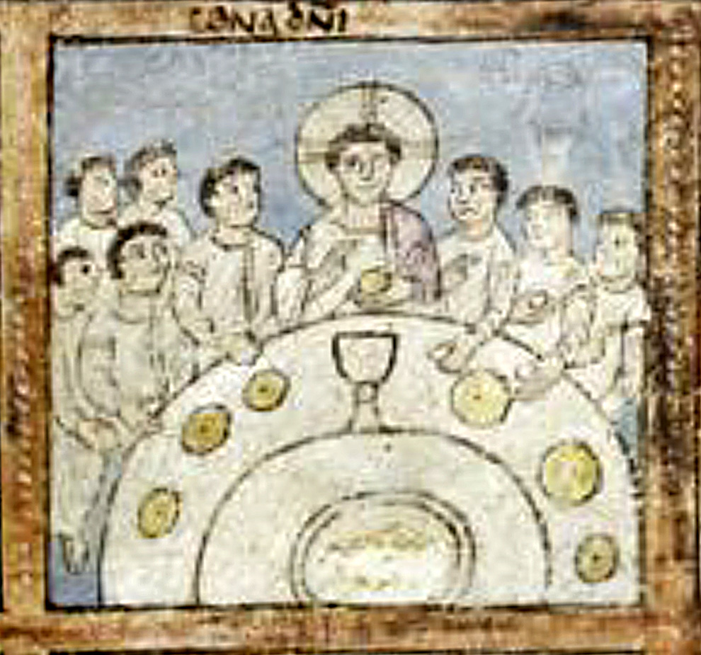 In the center of the table is a plate with two smudged areas that were surely fish when the illustration was first completed. (The plate with two fish had been a traditional element in the earlier iconography.) Ranged around the plate are six loaves; with the addition of the bread in Jesus' hand, we have an allusion to the two fish and seven loaves that he used to feed the four thousand in Matthew 15:32-38 and Mark 8:1-9. In the "Bread of Life discourse" in John's gospel Jesus declares that he himself is "the living bread which came down from heaven" and that "He that eateth my flesh, and drinketh my blood, hath everlasting life." The discourse was among the most important scriptural bases for the Christian belief in the real presence of Christ in the bread and wine, second only to the "this is my body" phrases in the synoptic gospels.2