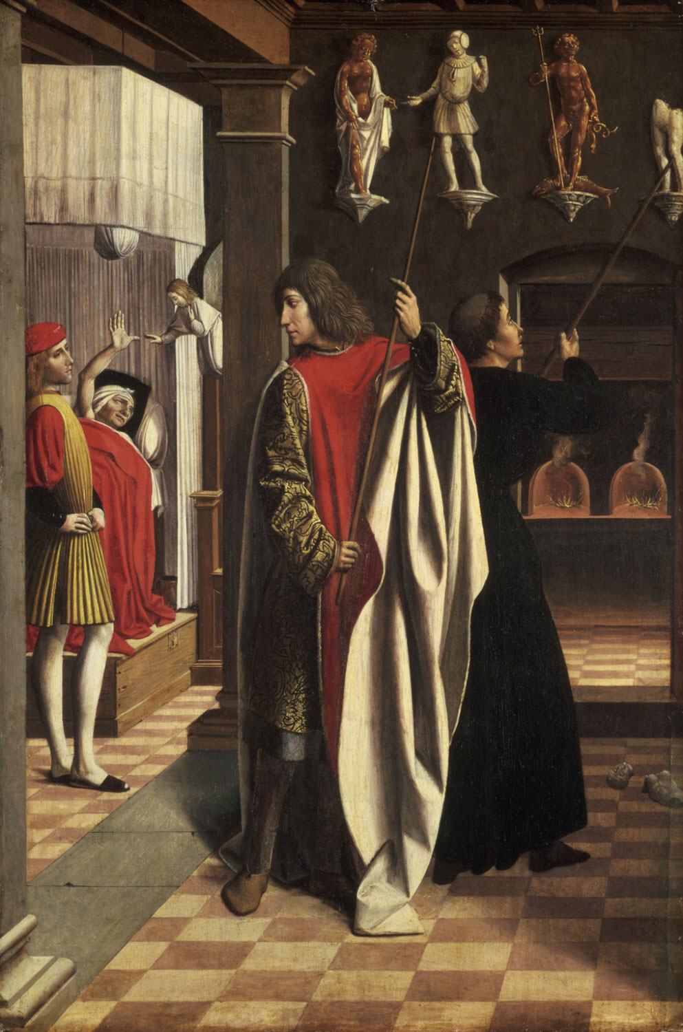 In the Golden Legend Sebastian tells the prefect Chromatius that he cannot be cured of his painful disease unless his two hundred idols are destroyed. Chromatius gives the go-ahead to Sebastian and the priest Polycarp, they destroy the idols, and the prefect is cured.