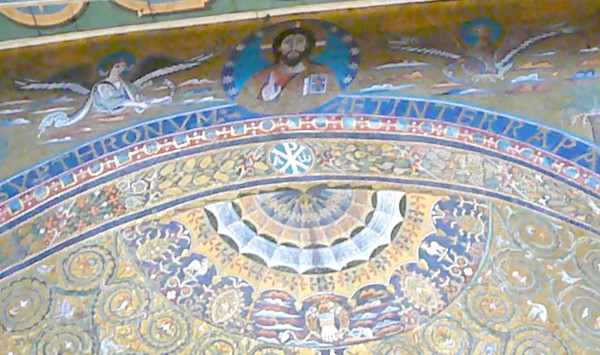 Christ is represented both directly (in the medallion) and by means of the chi-rho symbol at the apex of the rib. The Father is represented by the hand seen at the bottom center of this photograph.