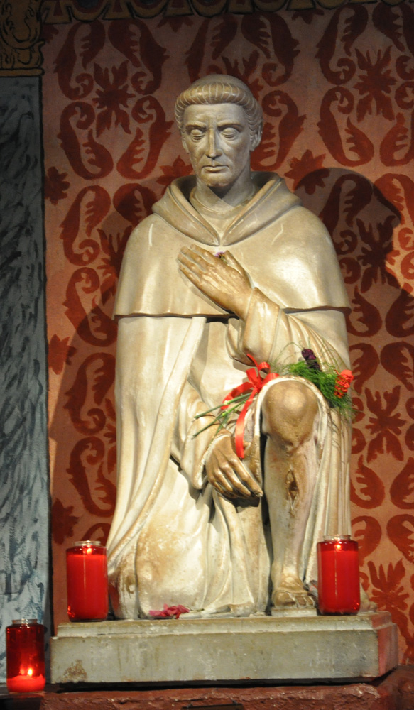St. Peregrine Laziosi (1260-1345) was a member of the Servite order noted for his piety and indifference to physical comforts. The lesion on the leg of this statue refers to a miracle related in his vita (Acta Sanctorum, April vol. 3, 838). The leg had developed a cancer that festered so badly none of his brother monks could come near the smell. A doctor advised that the leg must be removed or the disease would spread throughout his body. On the eve of the surgery, however, Peregrine prayed to Jesus to cure him, and in the morning the leg was completely healed.