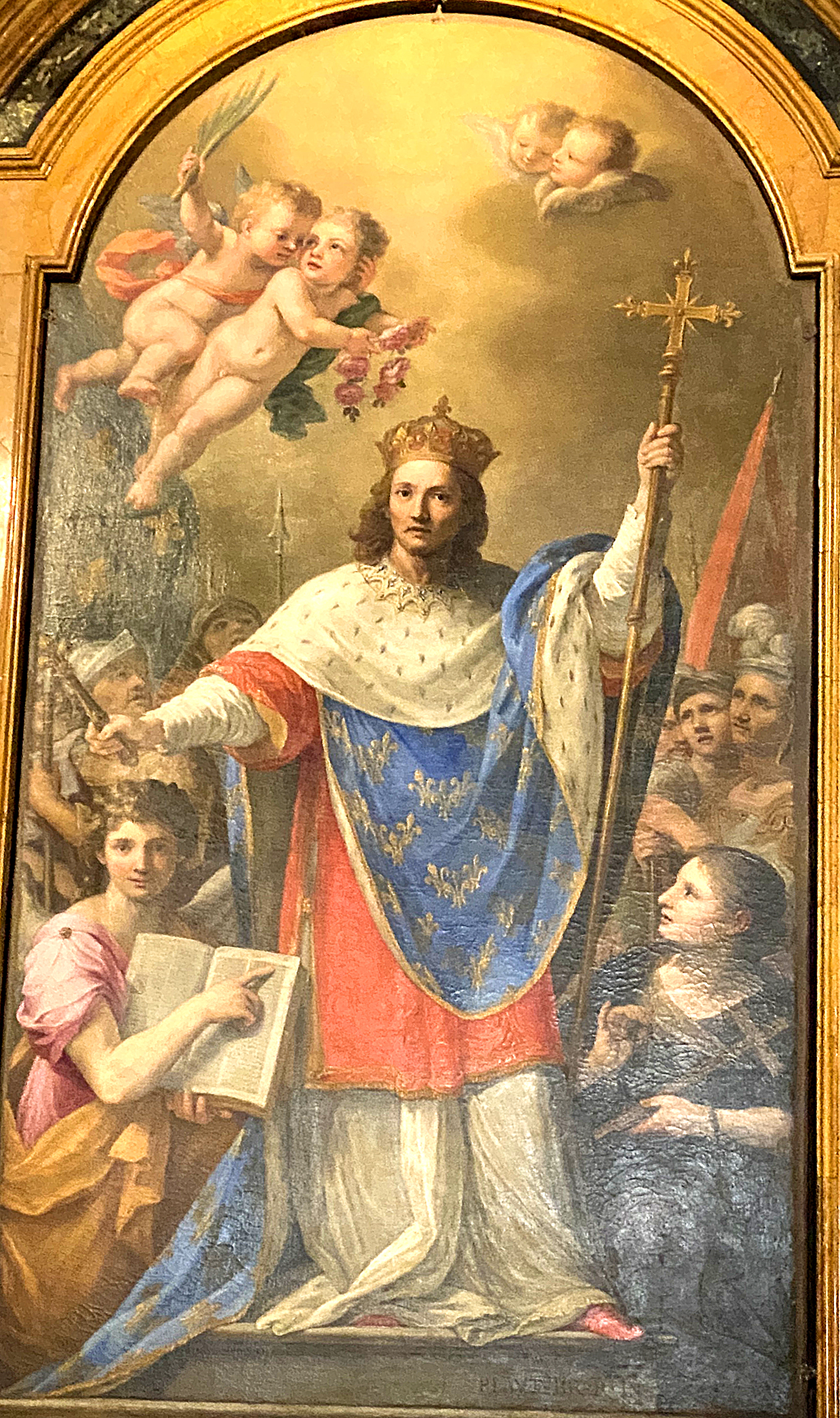 The king is easily identified by the crown, sceptre, and fleurs-de-lis. The putto approaching with a palm branch would designate him as a martyr. The Roman Martyrology lists him as a "confessor," not a martyr. He did die while on crusade in North Africa, as suggested by the soldiers behind him, but it was an illness that brought him down.