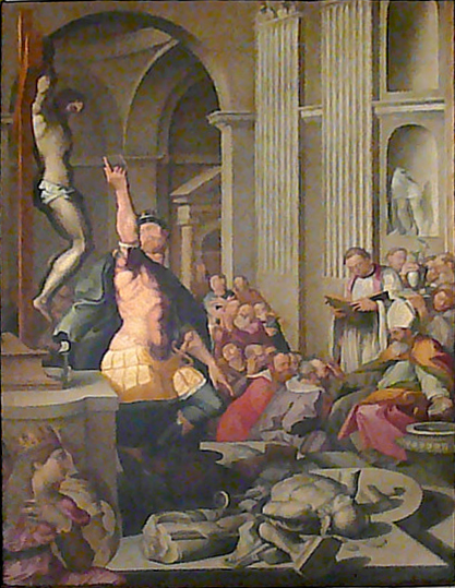 This is one of a set of large frescoes in the chapel by Siciolante and Jacopino del Conte tracing the conversion of Clovis and his court to the Christian faith.