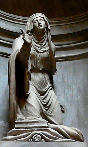 The label at the church says the statue represents St. Bridget of Sweded and was created for the Jubilee Year of 1650, but Maderno died in 1636 and the statue has no features associated with St. Bridget of Sweden other than a sort of generic habit and an upward glance.