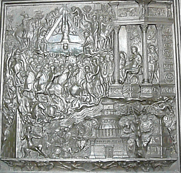 The figure in the bottom left corner to the right of the pyramid is a personification of Rome. (See the detail page for a discussion and enlargement.)