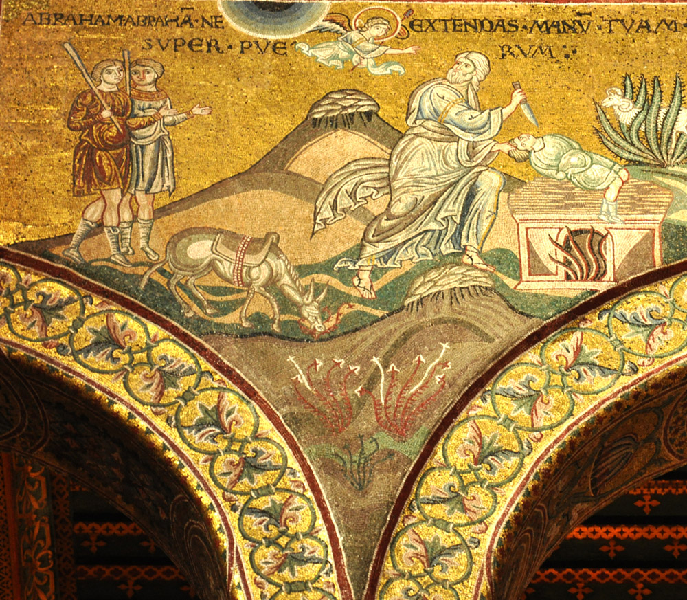 This image has all the details typical of this iconographic type: the mountain, the servants, the ass, Abraham with his sword, Isaac bound on a flaming altar, an angel (sometimes it is God's hand) telling Abraham to desist, and the ram caught in brambles. The inscription gives God's words in Genesis 22:11-12, abraham abraham ne extendas manum tuam super puerum, "Abraham, Abraham…Lay not thy hand upon the boy."