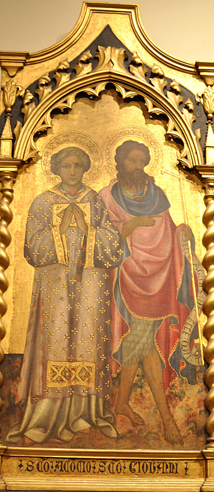 John the Baptist wears his camel-skin tunic under a red and blue mantle. As is common in his images, he holds a long cross with a banderole bearing his words from John 1:29,36, ecce agnus dei, ecce qui tollit peccata mundi ("Behold the lamb of God, behold him who takes away the sins of the world").
