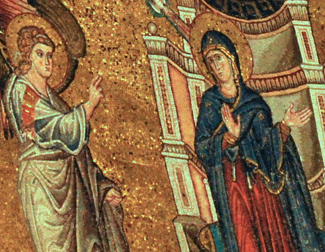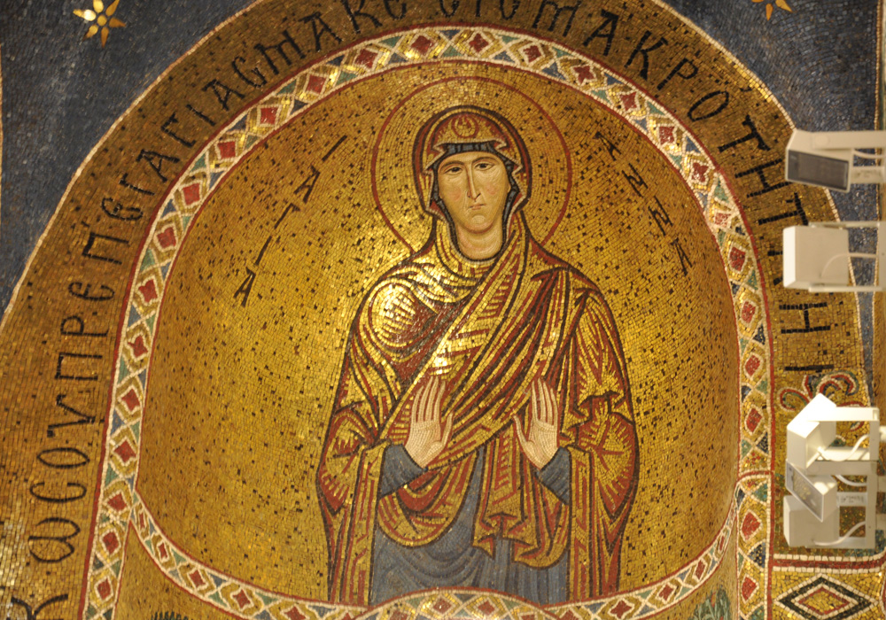 St. Anne is identified by the inscription in Greek. The meaning of a gesture with two palms out depends on context. In early Annunciations it signifies Mary's acceptance of her role; in other images it will register some sort of refusal on the part of a martyr or other saint. Here the intention may be to suggest Anne's participation in her daughter's divine mission.