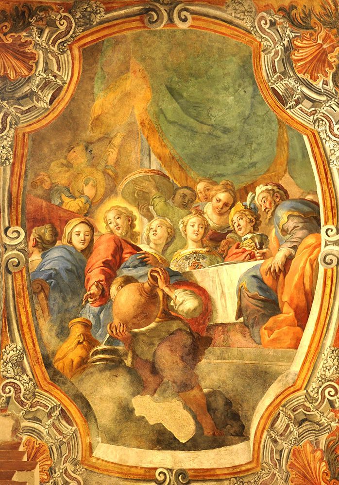 The ceiling fresco adopts a more modest version of the di sotto in su style popular at the time in larger Italian churches. The device allows the artist two points of emphasis. Jesus' gesture to the jars dramatically "below" is one, and the bride placed at the exact center of the composition is the other.