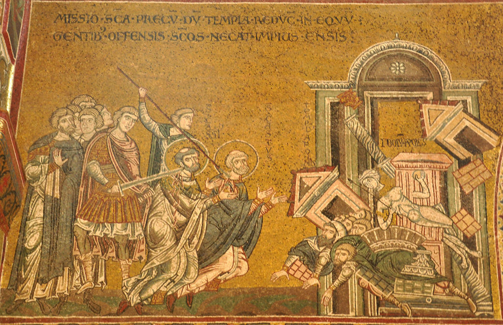 The inscription above the images says, MISSIO SANCTA PRECUM DUM TEMPLA REDUCUNTUR IN [A]EOVUM. GENTIBUS OFFENSIS SANCTOS NECAT IMPIUS [PRAESES AQUAVIV]ENSIS. – "The holy mission of prayers when the temples were brought down to the ground. The pagans being offended, the impious [prefect of Aquaviv]ensis kills the saints. (ENSIS means nothing. The Capuan Breviary, cited Acta Sanctorum, loc. cit., 22, calls the official in charge a praeses or "prefect" and locates the action in a Campanian city called "Aquavivensis.")