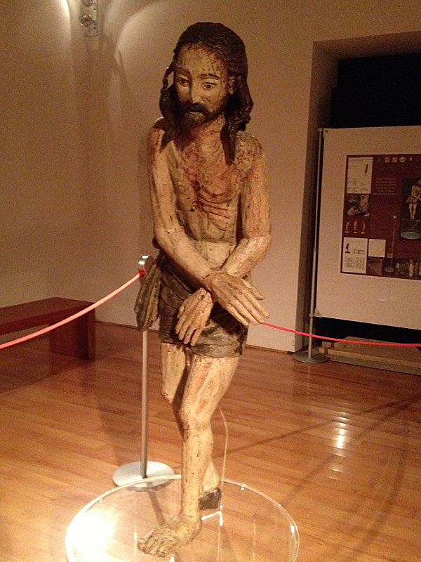 A standing statue of Jesus after he was scourged and tormented by the Roman soldiers. The position of the hands suggests that they were once tied with a cord that has now been lost. Judging from the blood on the brow, it is possible that a crown of thorns was also part of the original work.