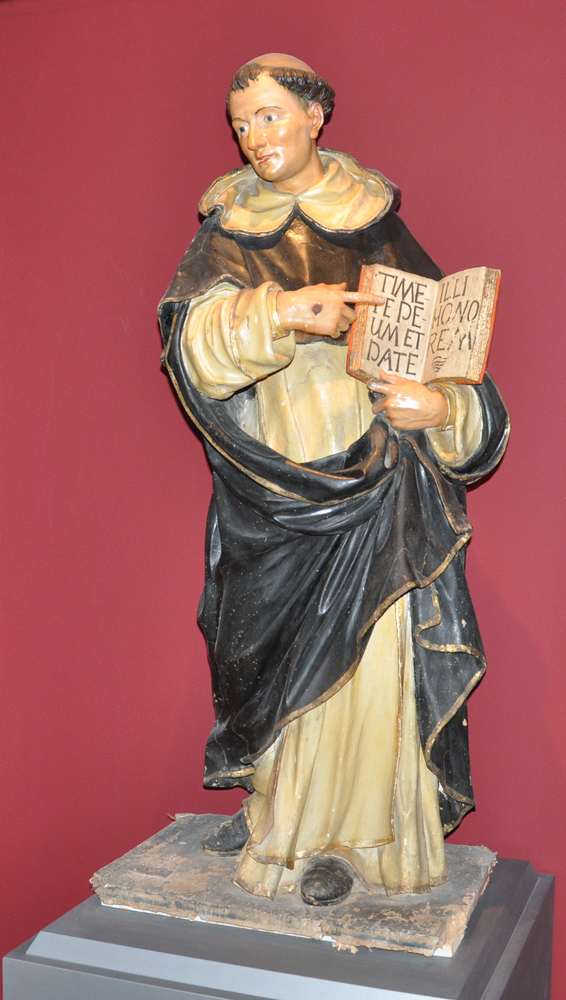 The saint is shown in his Dominican habit and tonsure, pointing to the verse from Revelation commonly associated with him.