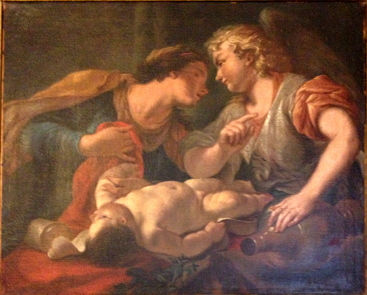 In the painting the angel holds Hagar's empty flask and points toward the spring while looking into her eyes. The eyes are beginning to open, reflecting what God is doing for her physically and, in Augustine's interpretation, what he is doing for all who "leave sin behind and turn to Christ."