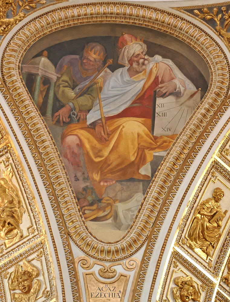 This is one of the father-and-son pendentives that picture ancestors of Jesus in the basilica's "Sistine Chapel." Ahaz and Hezekiah are kings of Judah listed in the genealogy in Matthew 1:9. Ahaz is especially important in Christian theology because it was to him that Isaiah said, "Behold a virgin shall conceive and bear a son, and his name shall be called Emmanuel" (Isaiah 7:14), a prophecy that Christians believe to refer to the virgin birth of Jesus.