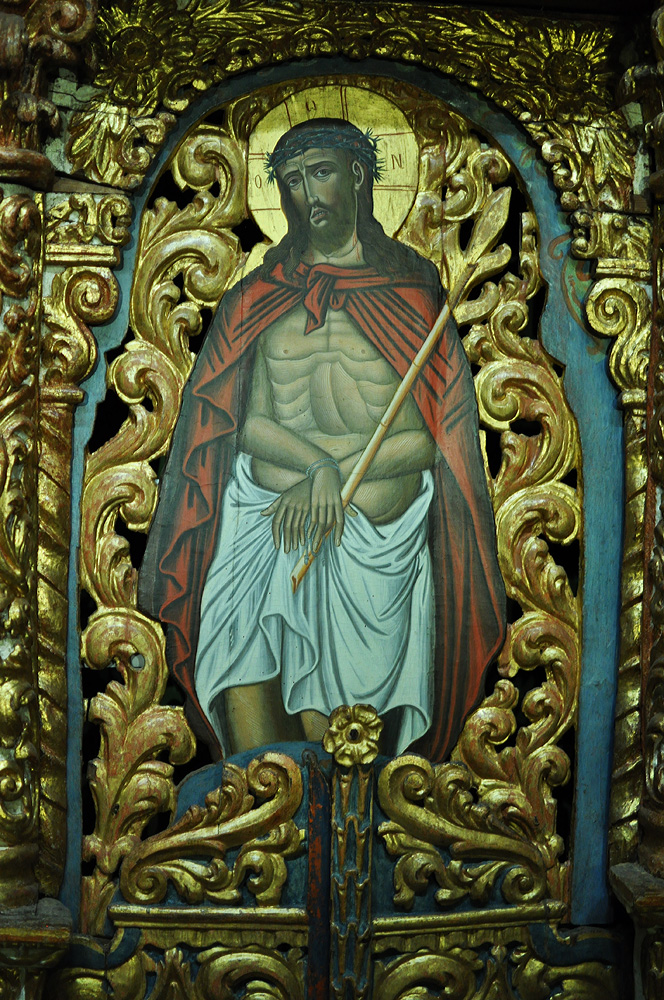 This is Jesus as he was presented to the crowd by Pilate, with the cape, reed, and crown of thorns given him by the soldiers, as well as the tied hands.
