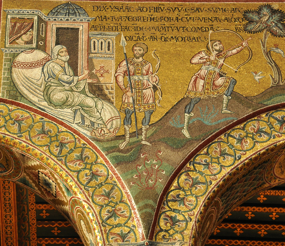 In the upper left of this panel we see Rebecca listening to these words. On the right Esau has taken his bow and shot down some birds. The bow is mentioned in a phrase from the text that the mosaicist left out of the inscription.