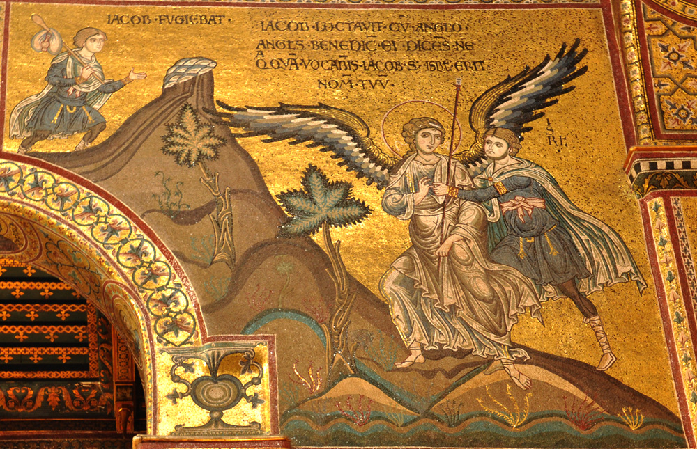Genesis 32:22-32. While traveling (with the same staff, pack, and amphora seen in a previous panel) Esau encounters an angel and wrestles with him, forcing the angel to bless him. It is in this blessing that the angel gives him the name Israel, "for you were strong against God." Like most angels in these mosaics, this one has a sceptre.