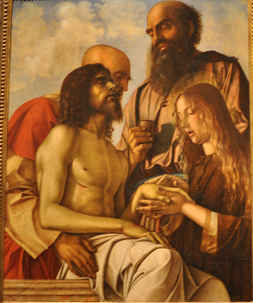 This Lamentation is unusual in that the Virgin Mary is not shown. The young woman at right is St. Mary Magdalene. She seems to be anointing Jesus's body with ointment from the jar being held by the man behind her. He and the man behind Jesus are probably Joseph of Arimathea and Nicodemus.