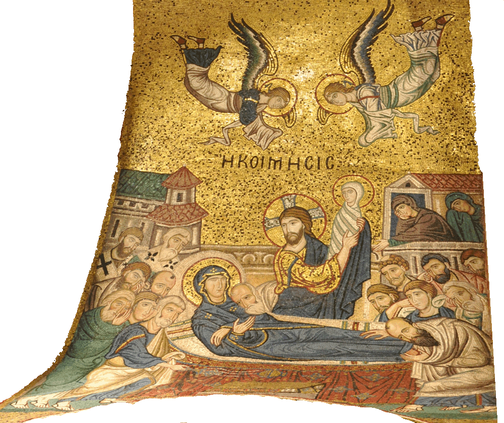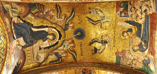 This mosaic is actually half of a paired composition that stretches from side to side of the church ceiling. In the other half, the Dormition, Mary's soul is the "baby," being carried to Heaven by her son and wrapped in the same swaddling clothes as the Christ Child's.