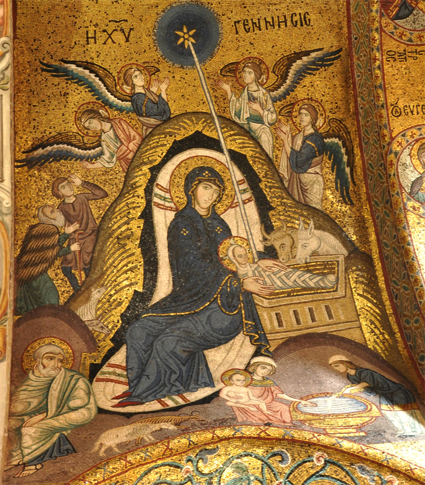 The mosaic presents all the common features of Orthodox Nativities of the time. In the center Mary relocates the child from the cave to the stable and places him in the manger, where the ox and ass feed. The other elements former a circle focusing on this central scene: clockwise from the bottom left, we see Joseph with his hand on his cheek, the shepherds hearing of the birth, the angels and star, and the midwives washing the baby.