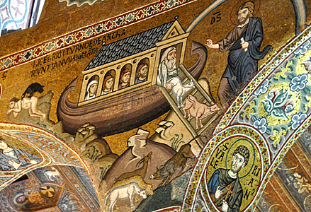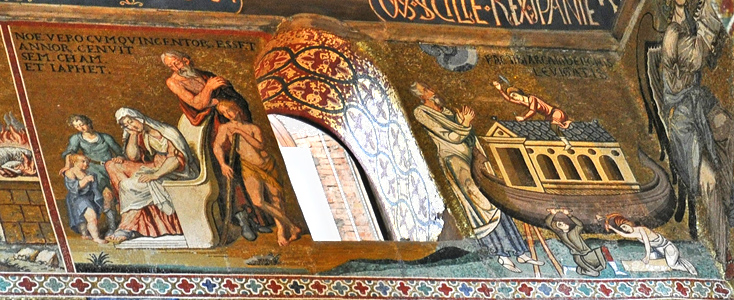 On the left of this panel the Noah cycle begins with a tender family portrait. It will end with the scene of Noah's drunken stupor and his boys' reactions. On the right Noah receives God's command and his sons get to work building the ark, a rudderless boat with a church-like structure amidships. (See the description page for a larger picture, explanation of the tools used, and more details.)