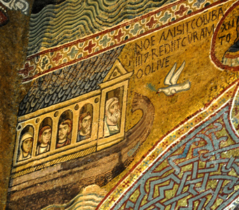 The one scene chosen for the actual flood is the return of the dove with the olive branch. The raven will not be seen until the next panel. (See the description page for more details.)