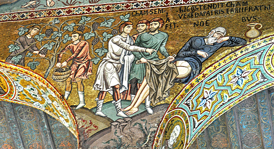 On the left men gather grapes from the vine that Noah planted. The wine from the grapes is in the jug on the right, beside the patriarch who has fallen asleep drunk and half-naked. Cham points to his father mockingly while the other sons avert their eyes and cover their father. (See the description page for more details and a larger picture.)