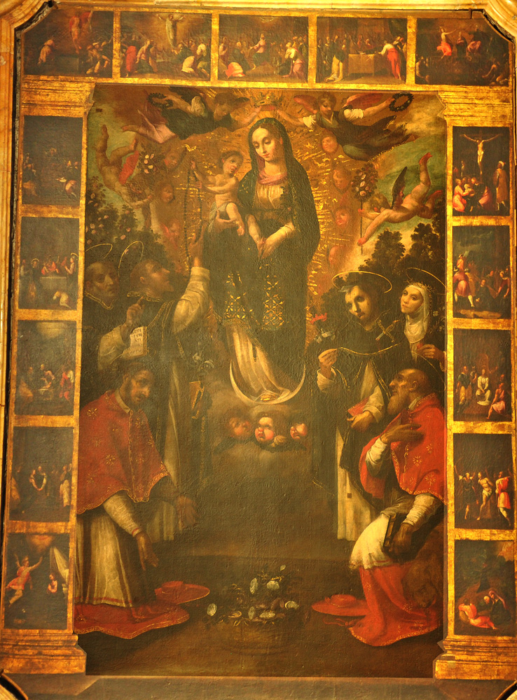 The subjects of the fifteen "decades" of the rosary are represented in the border insets. In the center, the Christ Child hands the rosary to St. Dominic. Behind Dominic is St. Vincent Ferrer, identified by the book open to a motto associated with him from Revelation 14:7, TIMETE DEUM ET DATE ILLUM HONOREM ("Fear God and give him honor.")