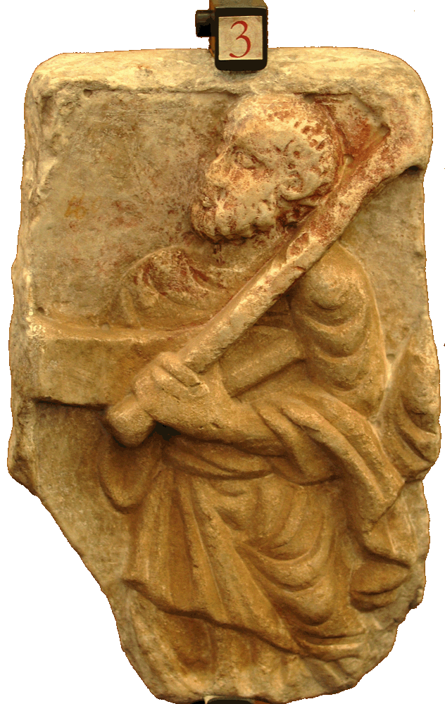 The figure has the short, square beard that characterizes St. Peter in sculpture of this era. On the basis of other Traditio Legis images, one may posit that the object against his breast is a fragment of a scroll and the object in his left hand a cross.