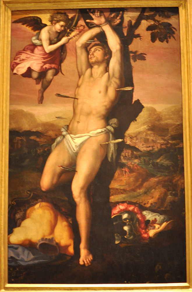 Not to split hairs, but in the legend the saint did not actually receive martyrdom when he was shot with the arrows shown. He died four days later, beaten to death by the servants of Diocletian and Maximian. And it is not just a palm that the angel in the painting brings, but a golden diadem as well.