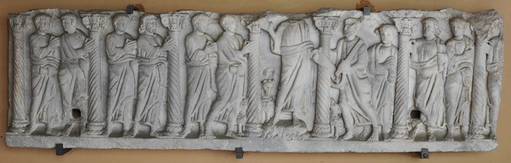 Possibly the relief is a Traditio Legis, the iconographic type in which Christ hands keys to St. Peter and a book or scroll to St. Paul. The short, square beard of the man at Christ's left may identify him as Peter. He receives a scroll and holds something in his left hand that could be a fragment of a cross or a set of very large keys. The man to the Christ's right holding a rolled-up scroll could thus be St. Paul.