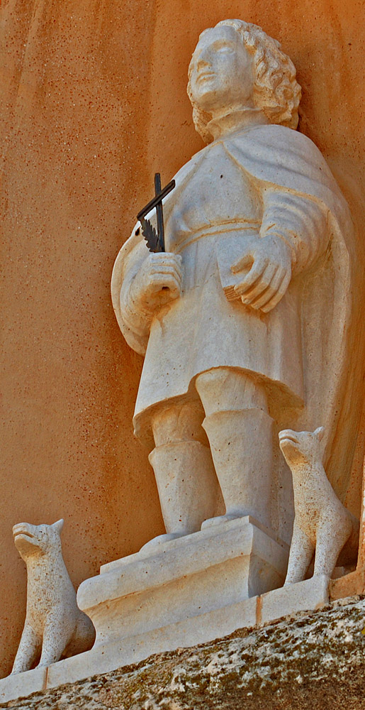 In addition to the palm branch signifying martyrdom, the statue features two of St. Vitus's specific attributes, a hand cross and a pair of dogs. The sign of the cross protected him when he was exposed to the lions in Rome's arena, and the dogs represent his successful intercessions for victims of dog bites. The book in his left hand may be simply iconographic boilerplate, but in his vita he does quote the scriptures quite often.