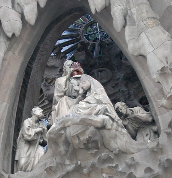 Gaudí borrows from two different medieval models for the Coronation. As in the most common model, it is Christ alone who crowns his mother. But the positions of the figures are taken from the model in which the Father crowns a kneeling Mary.
