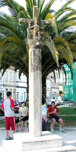 This is claimed to be the oldest cruceiro in Galicia. On the side shown here we see Christ in Majesty: hands raised, crowned, posed as if seated on a throne, and wearing a full-length vestment (close-up).