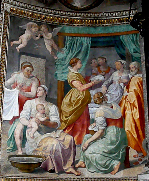 As in most Renaissance Birth of the Virgin paintings, the scene is a room in a comfortable private home, with the mother reclining in bed and attended by about a half-dozen servants. The sturdy young woman lifting the baby up from the basin is like the midwives in medieval versions. But she seems like a younger version of Anne, with her broad shoulders, her youthful appearance, and the echo of Anne's clothing in her white overdress and headband. (The headband may allude to the one offered to Anne by her maid-servant in the Protevangelium as an earnest that "the great day of the Lord is at hand.")